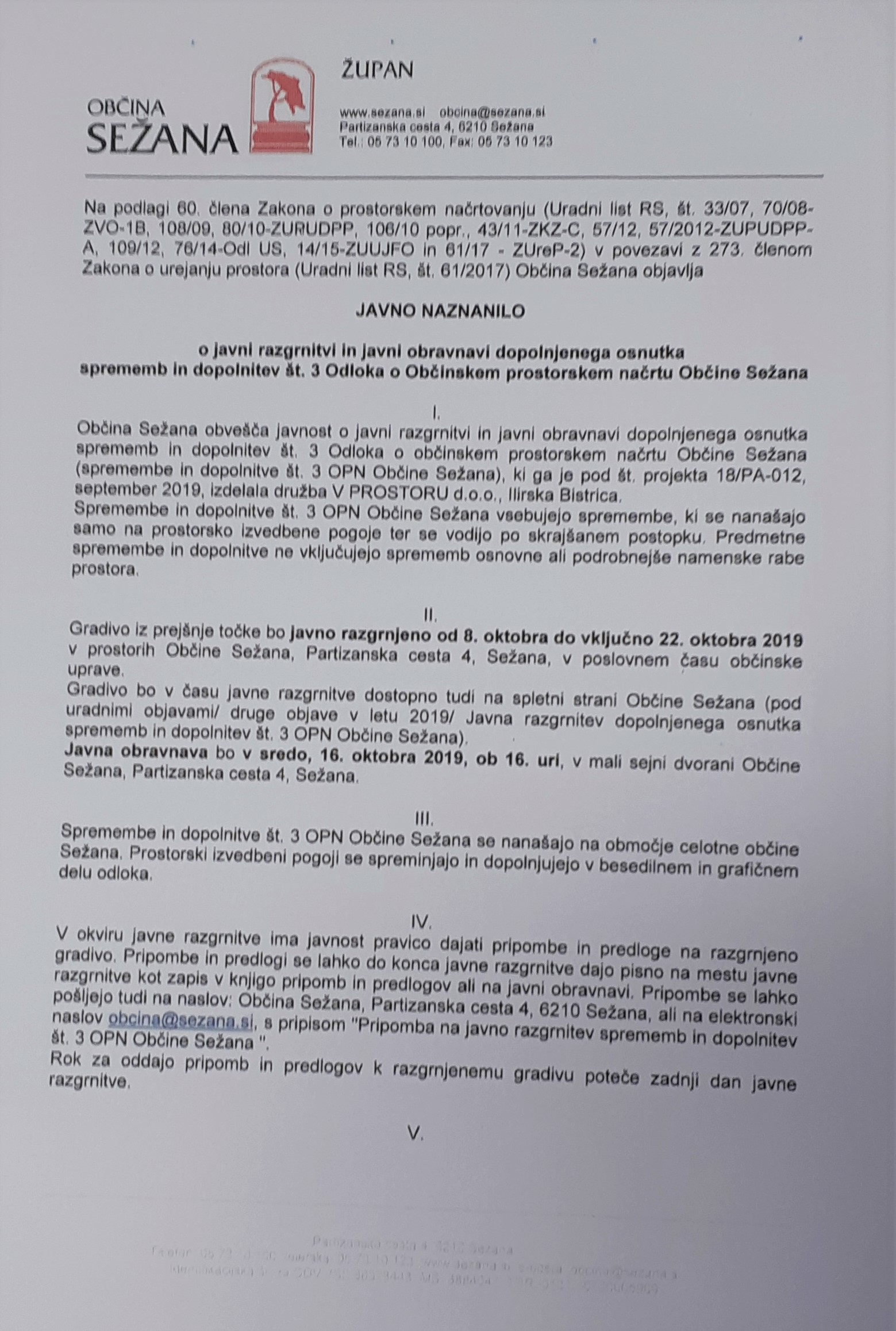 ..o razgrnitvi in javni obravnavi dopolnjenega osnutka sprememb in dopolnitev št. 3 Odloka o Občinskem prostorskem načrtu občine Sežana