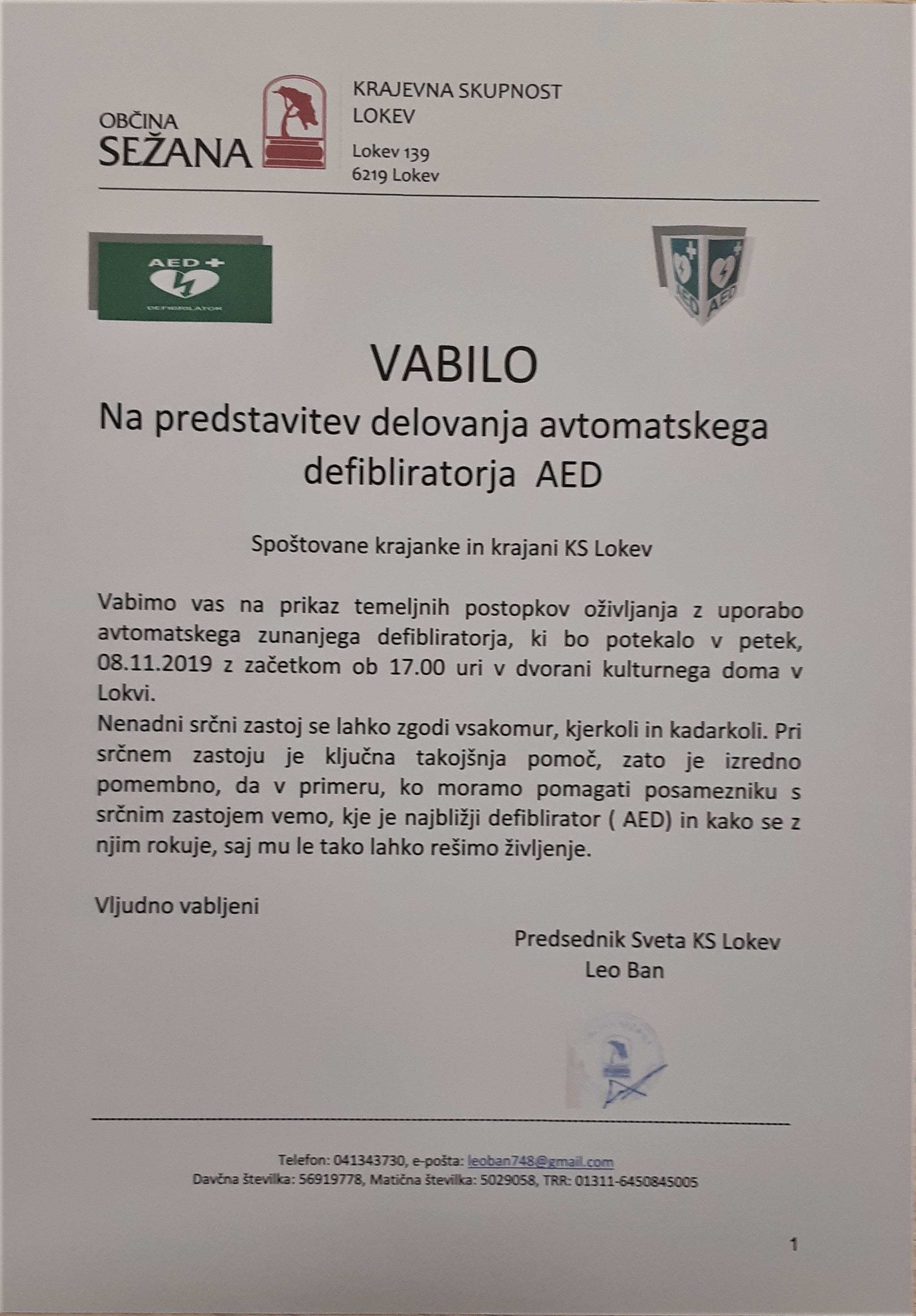 Vabimo vas na prikaz temeljnih postopkov oživljanja z uporabo avtomatskega zunanjega defibliratorja, ki bo potekalo v petek, 08.11.2019 z začetkom ob 17.00 uri v dvorani kulturnega doma v Lokvi.
