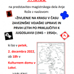 V petek, 02. decembra 2022 se nam je v prostorih kulturnega doma v Lokvi predstavila Anja Rože. Izrek, da jabolko ne pade daleč od drevesa v primeru mlade zgodovinarke iz vasi Prelože z gotovostjo drži. Anja nadaljuje s tradicijo družine Rože, svojega očeta Srečka, interpretatorja kulturne dediščine, mame Irene in sestre Aneje Rože, magistrice zgodovine.